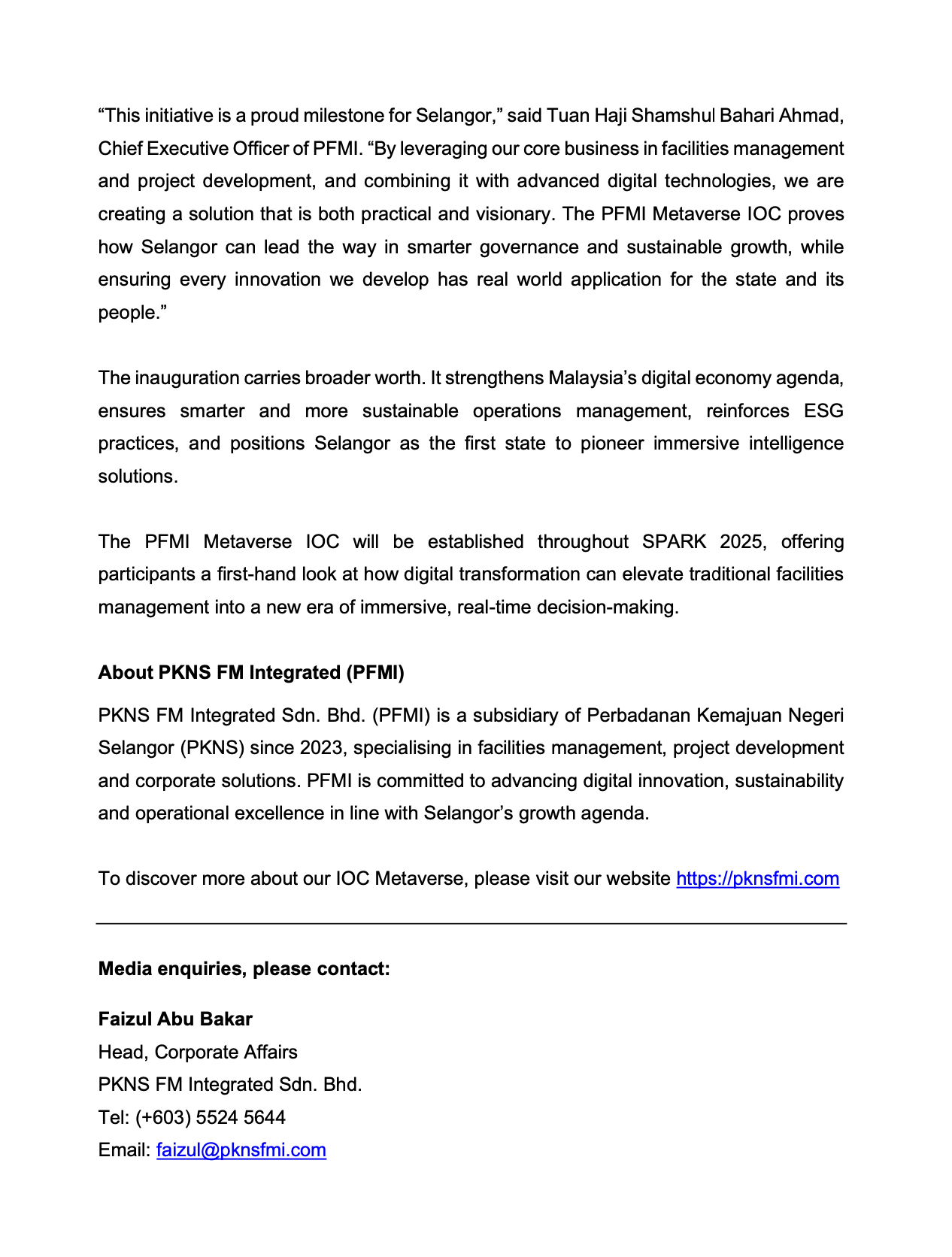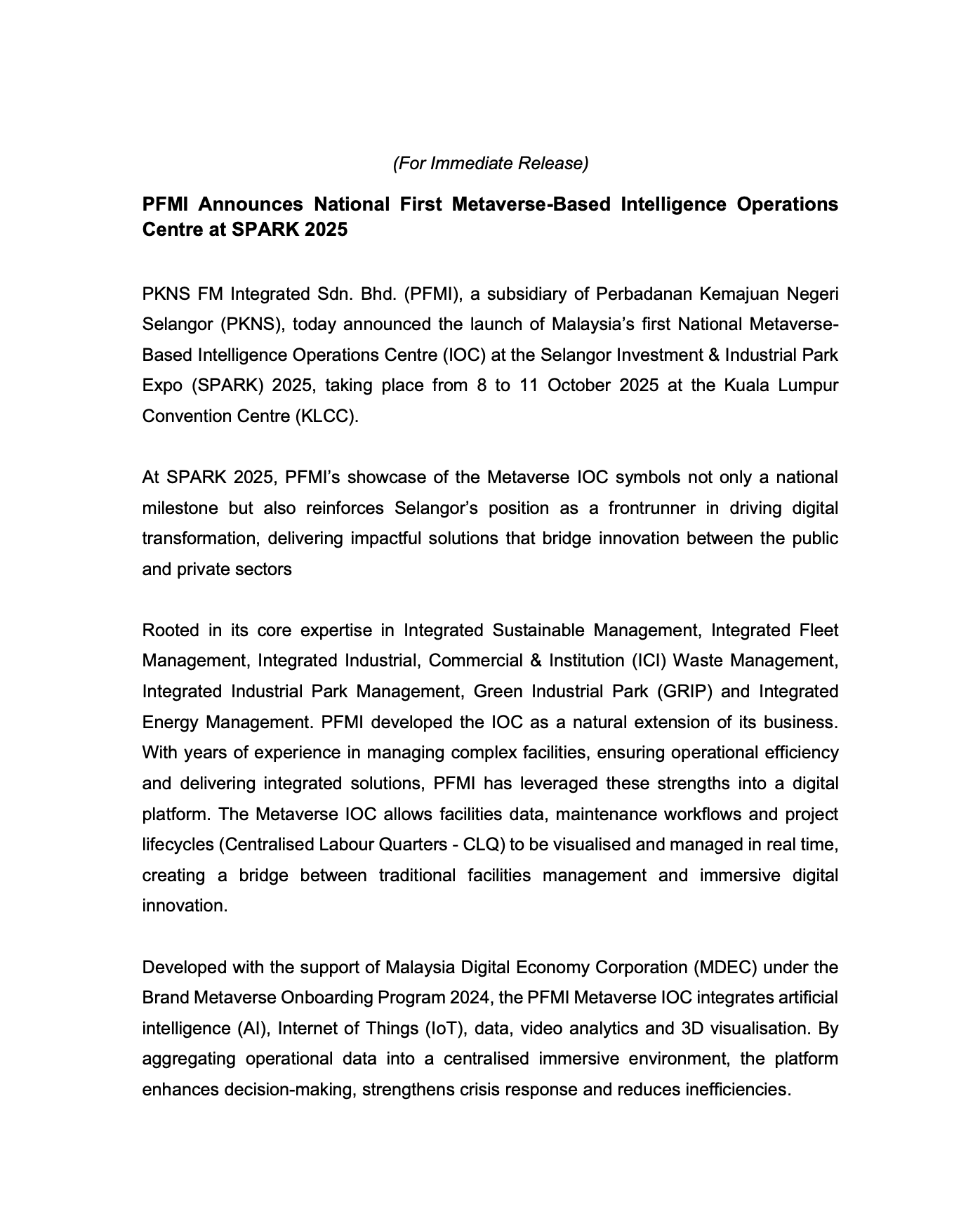 (Bahasa Inggeris) PFMI LAUNCHES MALAYSIA’S FIRST METAVERSE-BASED INTELLIGENCE OPERATIONS CENTRE https://www.bernama.com/en/general/news.php?id=2476126