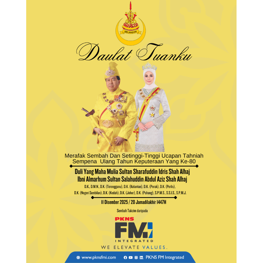 Merafak Sembah ucapan setinggi-tinggi tahniah dan ucapan selamat kepada Duli Yang Maha Mulia Sultan Sharafuddin Idris Shah Alhaj Ibni Almarhum Sultan Salahuddin Abdul Aziz Shah Alhaj sempena Ulang Tahun Hari Keputeraan Yang Ke-80 Duli Yang Maha Mulia Sultan Selangor.