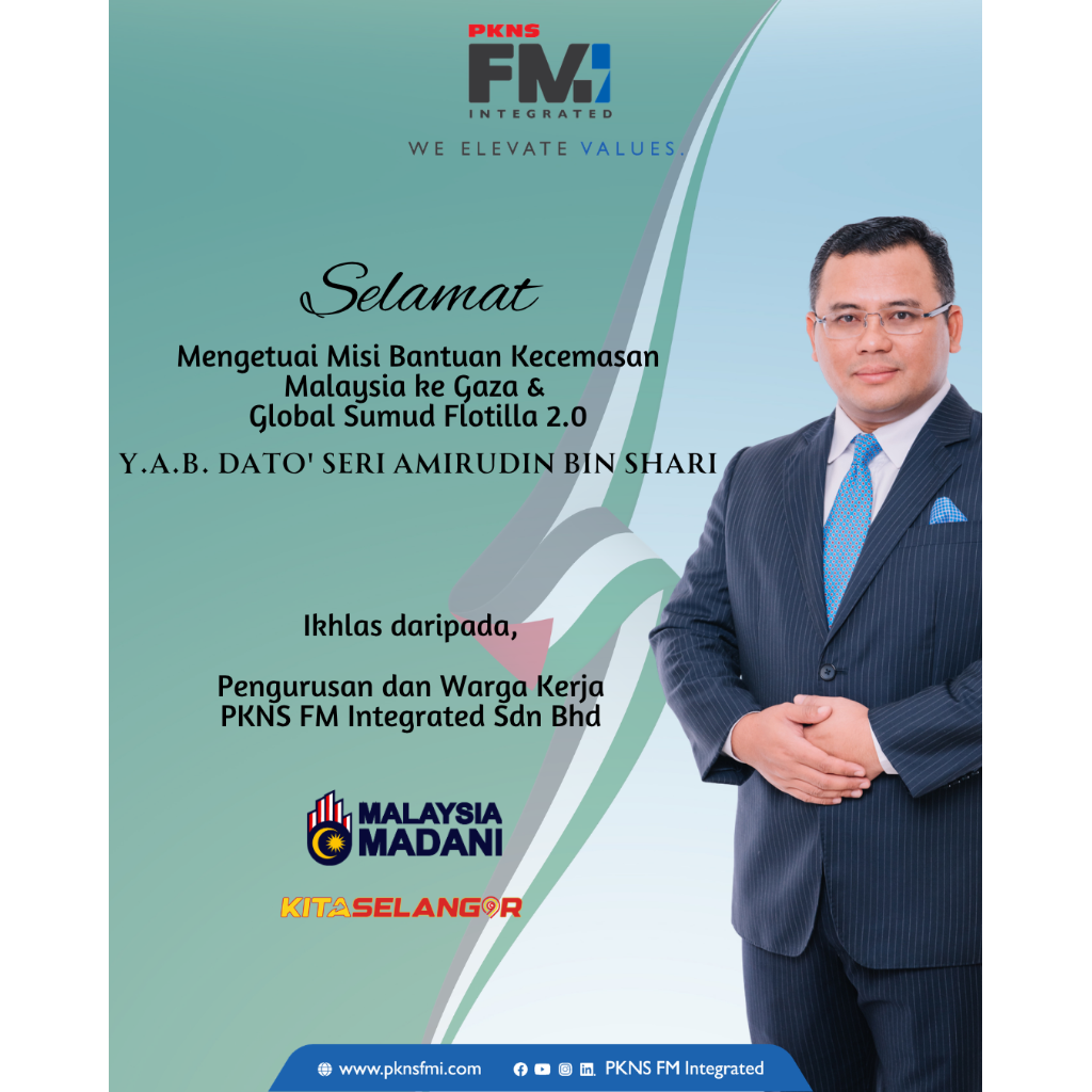 Kami di PKNS FM Integrated mendoakan agar YAB Dato’ Menteri Besar Selangor serta semua yang terlibat dalam Misi Bantuan Kemanusiaan Malaysia ke Gaza dan delegasi Global Sumud Flotilla 2.0 sentiasa berada dalam lindungan, dikurniakan kekuatan serta ketabahan sepanjang melaksanakan amanah yang besar ini.